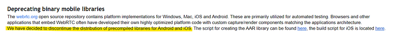 Google has stopped providing precompiled libraries for WebRTC on Android and iOS. Even though they continue using the same codebase for Chrome, Google Meet, and Google Duo, they no longer distribute the mobile libraries. This means developers need to create their own Android Archive (AAR) for up-to-date WebRTC integration.